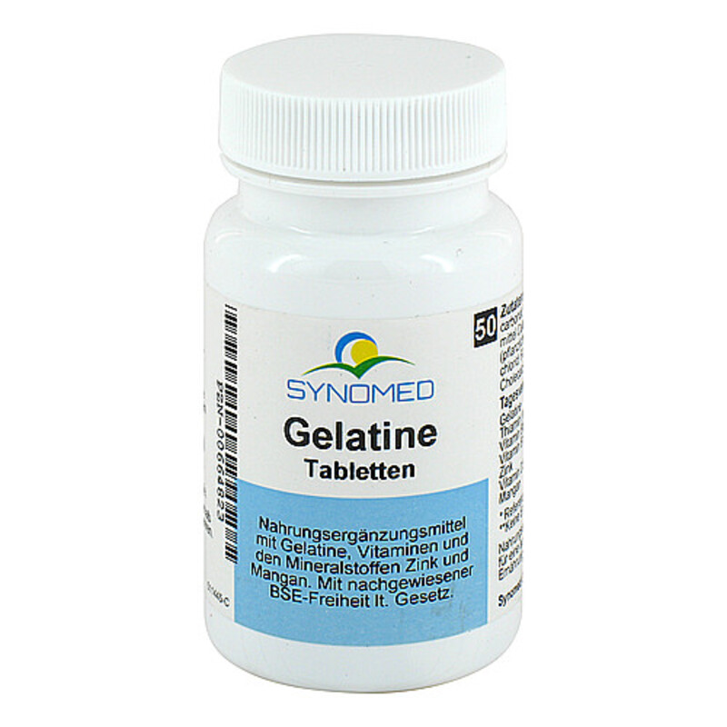 Nahrungsergänzungsmittel mit Gelatine, Vitaminen und den Mineralstoffen Zink und Mangan.