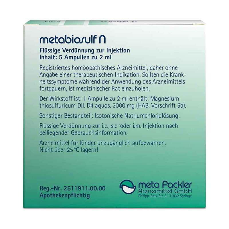 Metabiosulf N Flüssige Verdünnung zur Injektion ist ein homöopathisches Einzelmittel der Stoffgruppe: Mineralstoffe, Magnesium.