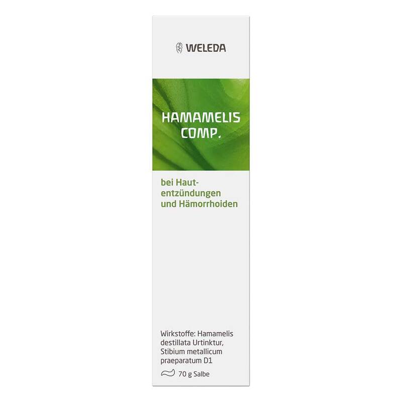 Hamamelis comp. Warnhinweis: Enthält Sesamöl, Wollwachs, Butylhydroxytoluol – bitte Packungsbeilage beachten. Gemäß der anthroposophischen Menschen- und Naturerkenntnis. Dazu gehören: Deformierende chronisch-entzündliche Veränderungen der Haut, insbesondere an der Haut-Schleimhaut-Grenze, z.B. Ekzeme, Geschwürbildungen (Ulzerationen), Schrunden (Rhagaden), Hämorrhoiden. Dosierung und Art der Anwendung Die Salbe mehrmals täglich auf die betroffenen Stellen auftragen oder als Salbenverband anwenden. Zur Anwendung als Salbenverband wird ein sauberes Stück Leinen- oder Baumwollstoff dünn mit der Salbe bestrichen, mit der Salbenseite über den betroffenen Stellen aufgelegt und befestigt. Nicht bei Kindern unter 12 Jahren anwenden. Zu Risiken und Nebenwirkungen lesen Sie die Packungsbeilage und fragen Sie Ihre Ärztin, Ihren Arzt oder in Ihrer Apotheke. Weleda AG, Schwäbisch Gmünd