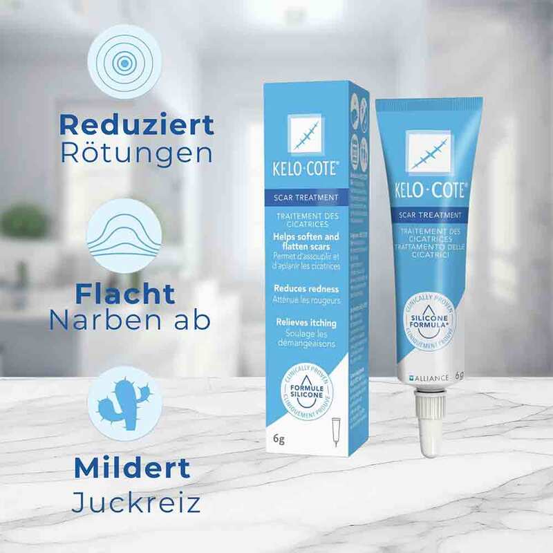 KELO-COTE® Narbengel ist ein selbsttrocknendes Silikongel zur Prävention und Behandlung wulstiger Narben, wie hypertropher Narben und Keloide. Durch KELO-COTE® Narbengel können Narben flacher, weicher und glatter werden. Mit Narben verbundene Beschwerden und der Juckreiz werden gelindert und die Hautverfärbung wird reduziert.