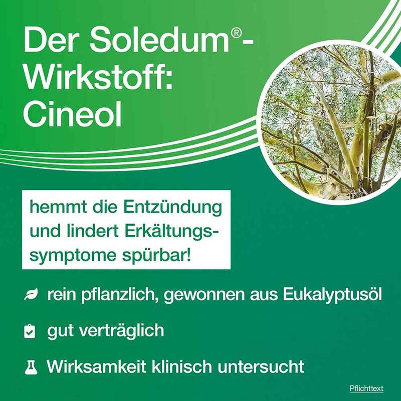 Soledum® Kapseln Wirkstoff: Cineol. Anwendungsgebiete: Zur Behandlung der Symptome bei Bronchitis, akuten, unkomplizierten, nicht bakteriellen Entzündungen der Nasennebenhöhlen (Rhinosinusitis) und Erkältungskrankheiten der Atemwege. Zur Zusatzbehandlung bei chronischen und entzündlichen Erkrankungen der Atemwege (z. B. der Nasennebenhöhlen). Warnhinweis: Enthält Sorbitol. Packungsbeilage beachten. Zu Risiken und Nebenwirkungen lesen Sie die Packungsbeilage und fragen Sie Ihre Ärztin, Ihren Arzt oder in Ihrer Apotheke.