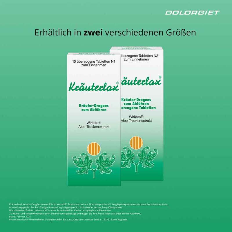 Pflichtangaben:Kräuterlax® Kräuter-Dragées zum Abführen. Wirkstoff: Aloe-Trockenextrakt. Anwendungsgebiet: Pflanzliches Arzneimittel zur kurzfristigen Anwendung bei gelegentlich auftretender Verstopfung. Warnhinweise: Enthält Lactose und Sucrose. Arzneimittel für Kinder unzugänglich aufbewahren. Zu Risiken und Nebenwirkungen lesen Sie die Packungsbeilage und fragen Sie Ihre Ärztin, Ihren Arzt oder in Ihrer Apotheke. Stand: Februar 2021. Dolorgiet GmbH & Co. KG, Otto-von-Guericke-Straße 1, 53757 Sankt Augustin.