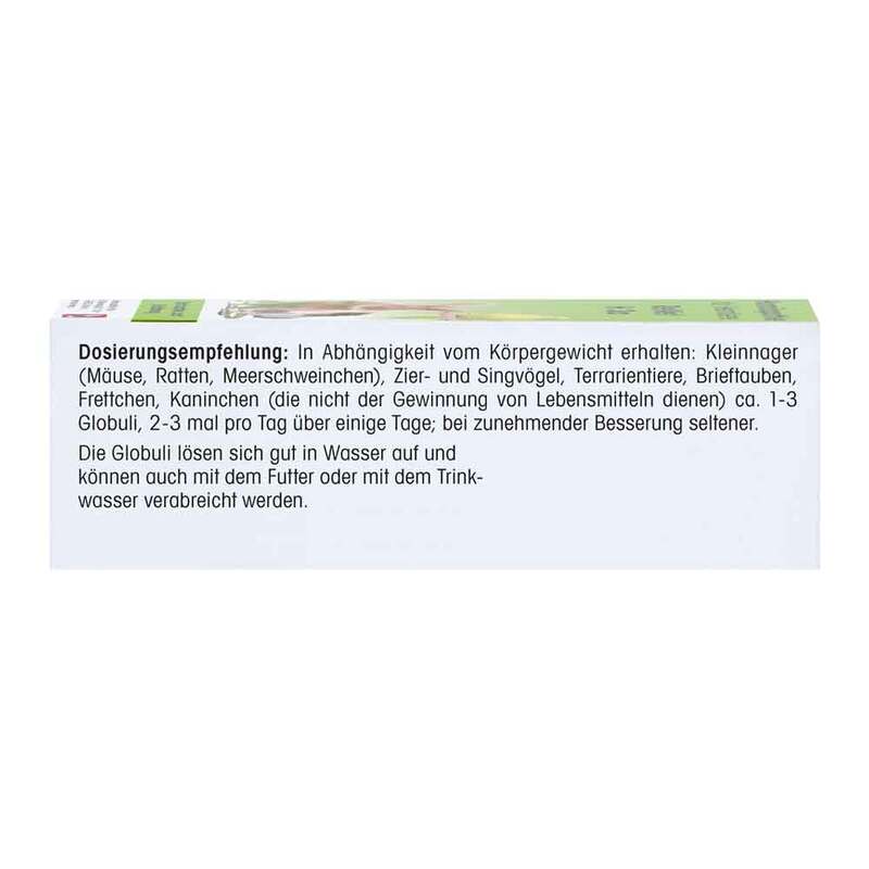 In Abhängigkeit vom Körpergewicht erhalten: Kleinnager (Mäuse, Ratten, Meerschweinchen), Zier- und Singvögel, Terrarientiere, Brieftauben, Frettchen, Kaninchen (die nicht der Gewinnung von Lebensmitteln dienen) ca. 1-3 Globuli, 2- bis 3-mal pro Tag über einige Tage; bei zunehmender Besserung seltener.