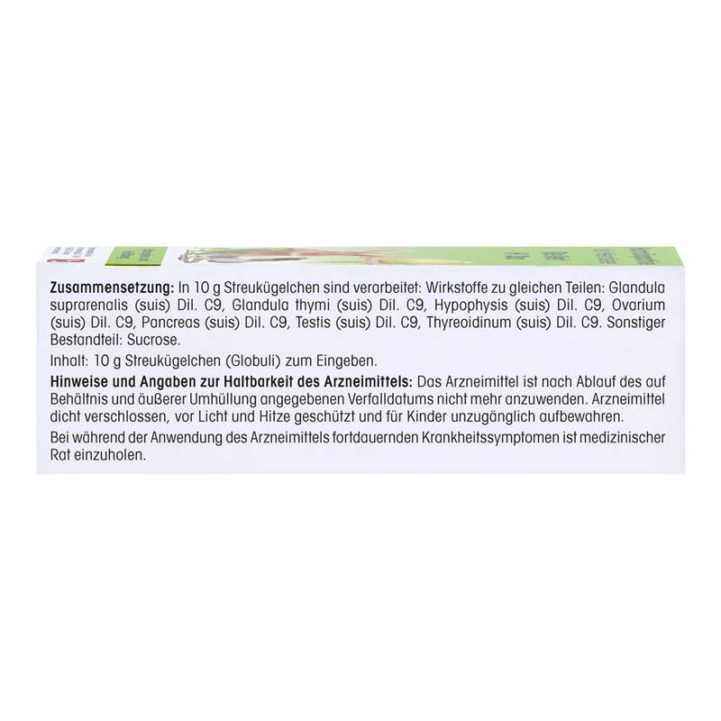 Die Streukügelchen enthalten zu gleichen Teilen Glandula suprarenalis (suis) C9, Glandula thymi (suis) C9, Hypophysis (suis) C9, Ovarium (suis) C9, Pancreas (suis) C9, Testis (suis) C9, Thyreoidinum (suis) C9