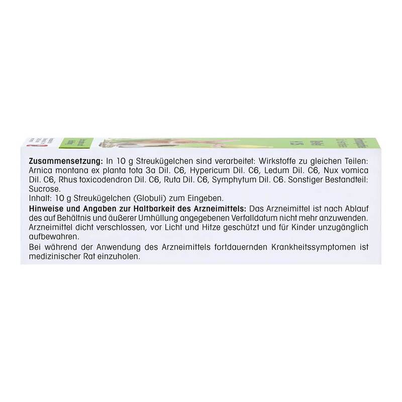 Die Streukügelchen enthalten zu gleichen Teilen Arnica montana ex planta tota C6, Hypericum C6, Ledum C6, Nux vomica C6, Rhus toxicodendron C6, Ruta C6, Symphytum C6