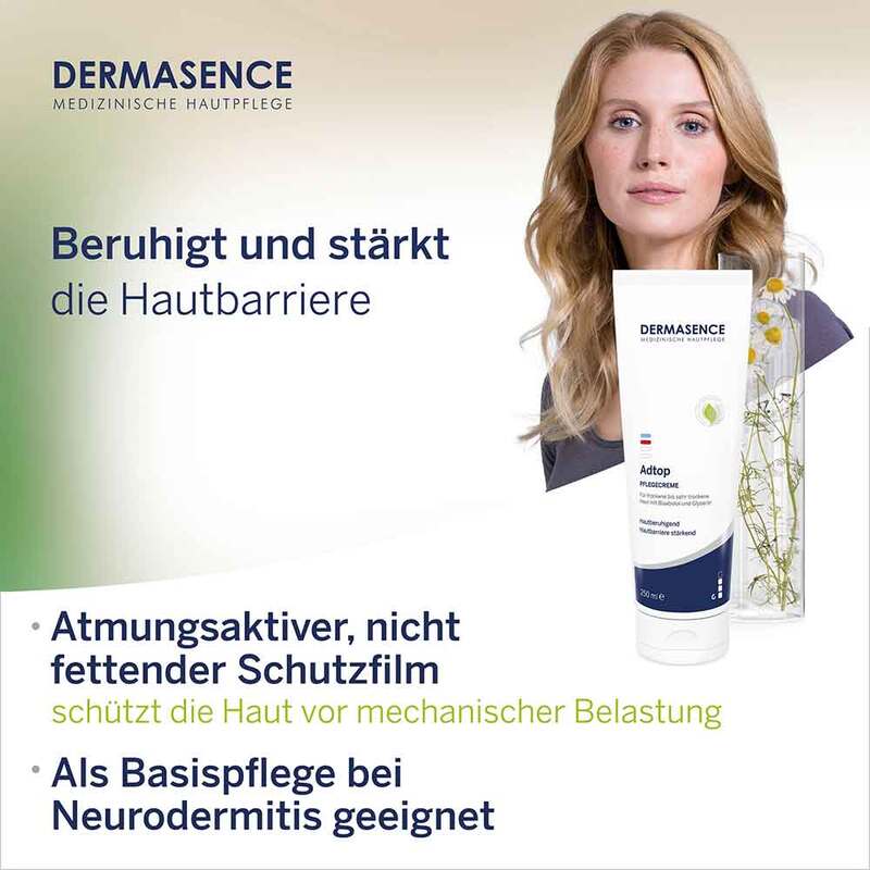 Bei chronischen Hautkrankheiten wie Neurodermitis hat sich die Dermasence Adtop Creme im Rahmen der Intervalltherapie vielfach bewährt. Das sehr gut verträgliche, parfümfreie Präparat eignet sich auch für Schutz und Pflege empfindlicher Kinderhaut.