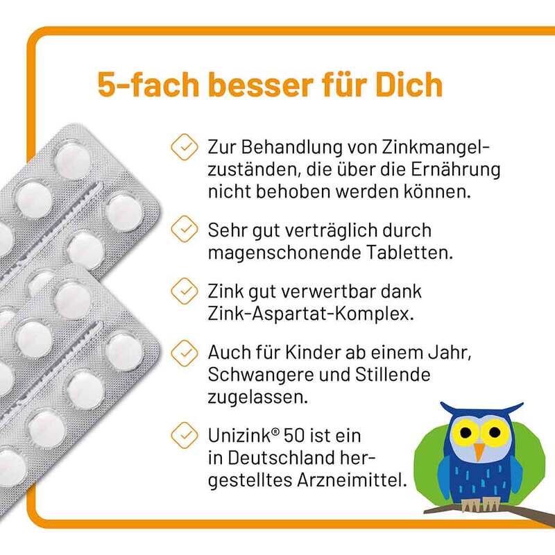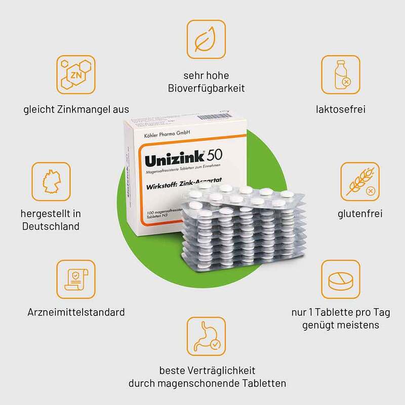 Unizink® 50. Wirkstoff: Zink-Aspartat. Anwendungsgebiete: Zur Behandlung von Zinkmangelzuständen, die ernährungsmäßig nicht behoben werden können. Warnhinweise: enthält Sorbitol. Zu Risiken und Nebenwirkungen lesen Sie die Packungsbeilage und fragen Sie Ihre Ärztin, Ihren Arzt oder in Ihrer Apotheke. Köhler Pharma GmbH, 64665 Alsbach.