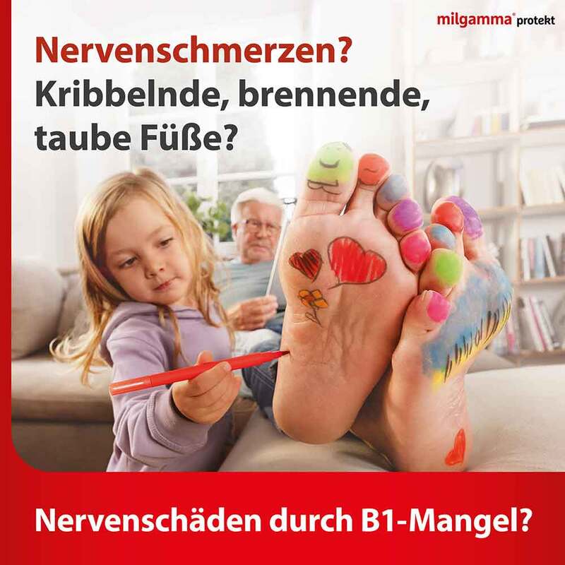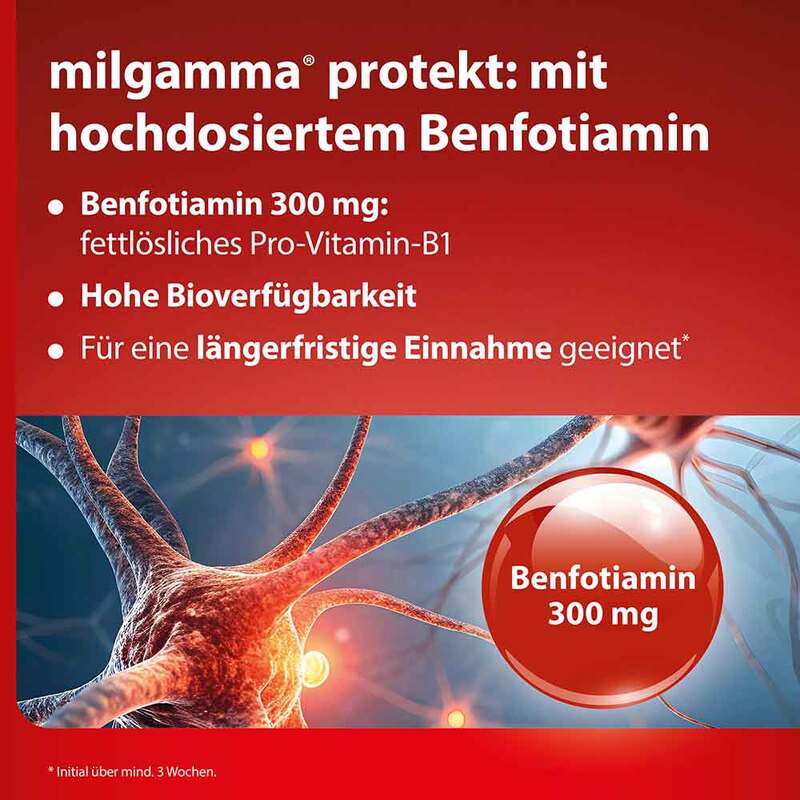 milgamma® protekt. Wirkstoff: Benfotiamin 300 mg. Anwendungsgebiete: Therapie od. Prophylaxe von klinischen Vitamin-B1-Mangelzuständen, sofern diese nicht ernährungsmäßig behoben werden können; Behandlung von Neuropathien u. kardiovaskul. Stör., d. durch Vitamin-B1-Mangel hervorgerufen werden. Zu Risiken und Nebenwirkungen lesen Sie die Packungsbeilage und fragen Sie Ihre Ärztin, Ihren Arzt oder in Ihrer Apotheke. WÖRWAG Pharma GmbH & Co. KG, 71034 Böblingen