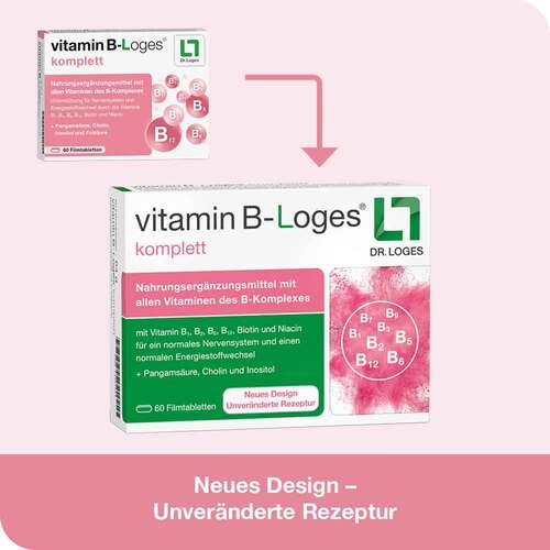 vitamin B-Loges komplett ist ein Nahrungsergänzungsmittel mit allen Vitaminen des B-Komplexes zur Unterstützung für Nervensystem und Energiestoffwechsel durch die Vitamine B1, B2, B6, B12, Niacin und Biotin*