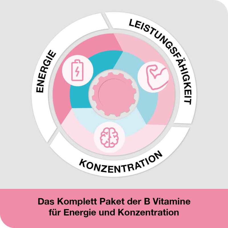 * Vitamin B1, B2, B3, B5, B6, B7 und B12 tragen zu einem normalen Energiestoffwechsel bei. Vitamin B2, B3, B5, B6, B12 und Folsäure tragen zur Verringerung von Müdigkeit und Ermüdung bei. Vitamin B5 (Pantothensäure) trägt zu einer normalen geistigen Leistungsfähigkeit bei. Vitamin B1, B2, B3, B6, B7 und B12 tragen zu einer normalen Funktion des Nervensystems bei. Vitamine B1, B3, B6, B7, B12 und Folsäure tragen zur normalen psychischen Funktion bei. Vitamine B6, B12 und Folsäure tragen zu einer normalen Funktion des Immunsystems bei. Vitamin B3 (Niacin) und B7 (Biotin) tragen zur Erhaltung normaler Haut bei. Vitamin B3 (Niacin) trägt zur Erhaltung normaler Schleimhäute bei. Vitamin B6 trägt zu einem normalen Eiweiß- und Glycogenstoffwechsel bei. Biotin (Vitamin B7) trägt zu einem normalen Stoffwechsel von Makronährstoffen bei. Cholin trägt zu einem normalen Fettstoffwechsel bei. Riboflavin (Vitamin B2), Vitamin B6 und Vitamin B12 tragen zur Erhaltung normaler roter Blutkörperchen bei. Folsäure trägt zu einer normalen Blutbildung bei. Riboflavin (Vitamin B2) trägt dazu bei, die Zellen vor oxidativem Stress zu schützen. Vitamin B12 und Folsäure haben eine Funktion bei der Zellteilung.