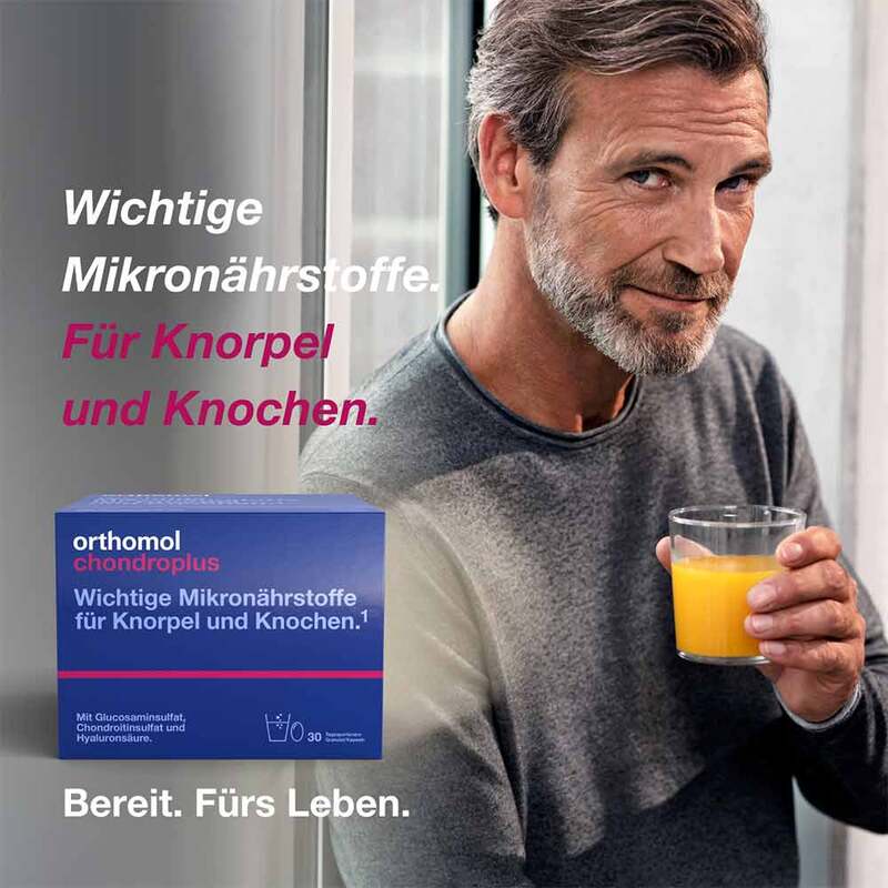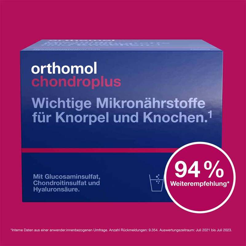 Orthomol Chondroplus ist ein Nahrungsergänzungsmittel: Mit Vitamin C als Beitrag zu einer normalen Kollagenbildung für eine normale Funktion von Knorpel und Knochen.*
