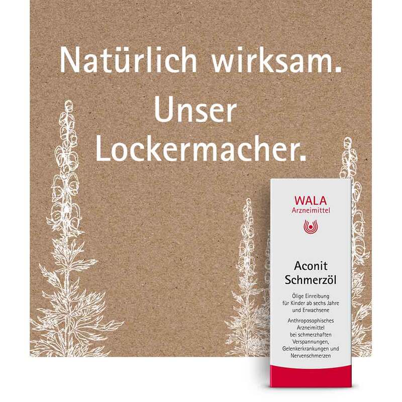 Aconit Schmerzöl. Ölige Einreibung. Anwendungsgebiete gemäß der anthroposophischen Menschen- und Naturerkenntnis. Dazu gehören: Anregung des Wärmeorganismus und Integration von Stoffwechselprozessen bei schmerzhaften entzündlichen Erkrankungen, die vom Nerven-Sinnes-System ausgehen, z.B. Nervenschmerzen (Neuralgien), Nervenentzündungen (Neuritiden), Gürtelrose (Herpes zoster), rheumatische Gelenkerkrankungen. Warnhinweis: Enthält Erdnussöl. WALA Heilmittel GmbH, 73085 Bad Boll/Eckwälden. Zu Risiken und Nebenwirkungen lesen Sie die Packungsbeilage und fragen Sie Ihre Ärztin, Ihren Arzt oder in Ihrer Apotheke.