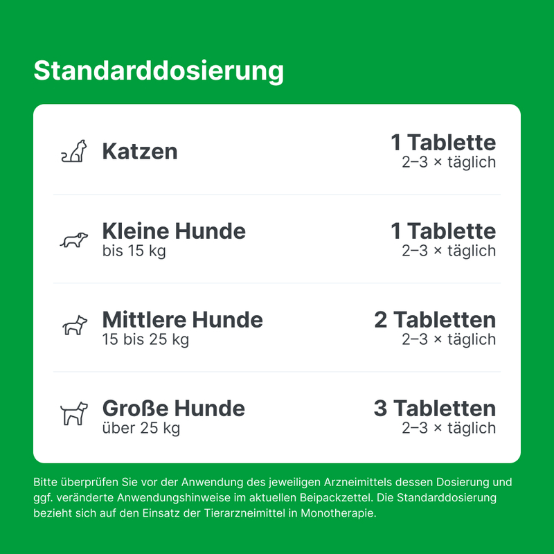 Bei anhaltenden, unklaren, periodisch oder neu auftretenden Beschwerden, Fieber oder schweren Störungen des Allgemeinbefindens sollte umgehend ein Tierarzt/eine Tierärztin aufgesucht werden.