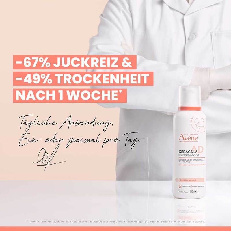 Die Haut wird durch die Anwendung der Avene XeraCalm A.D Creme gepflegt und mit Feuchtigkeit versorgt. Sie beruhigt die Haut intensiv und sorgt dafür, dass die therapiefreien Intervalle bei atopischen Hautzuständen verlängert werden.