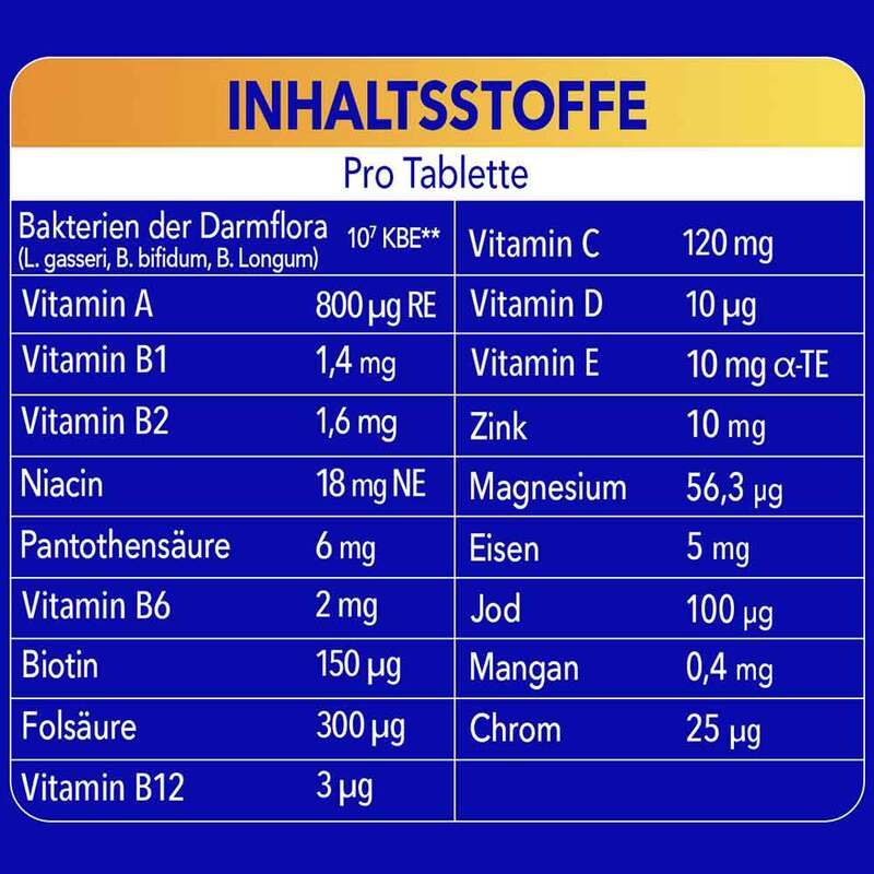 Trennmittel: Calciumphosphate; Füllstoff: Cellulose; Ascorbinsäure; Magnesiumoxid; Inulin; DL-alpha-Tocopherylacetat; Überzugsmittel: Hydroxypropyl-methylcellulose; Maltodextrin; Dextrose; Trennmittel: Mono- und Diglyceride von Speisefettsäuren; Nicotinamid; Füllstoff: Polyvinylpyrrolidon; Überzugsmittel: Hydroxypropylcellulose; Stärke; Eisensulfat; modifizierte Stärke; Zinkoxid; Füllstoff: Polyvinylpolypyrrolidon; Trennmittel: Magnesiumsalze der Speisefettsäuren; Calcium-D-pantothenat; Füllstoff: vernetzte Natriumcarboxymethylcellulose; Pyridoxinhydrochlorid; Thiaminmononitrat; Riboflavin; Farbstoff: Eisenoxide und Eisenhydroxide; Trennmittel: Siliciumdioxid; Bakterienkulturen (Lactobacillus gasseri PA 16/8, Bifidobacterium bifidum MF 20/5, Bifidobacterium longum SP 07/3)*; Mangansulfat; Retinylacetat; Zucker; Folsäure; D-Biotin; Kaliumiodid; mittelkettige Triglyceride (aus Palmöl); Chrom-(III)-chlorid; Natriumselenat; Cholecalciferol; Cyanocobalamin.