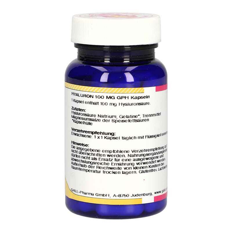 Hyaluron 100 mg GPH Kapseln sind ein Qualitätsprodukt mit hochwertigem, fermentativ gewonnenem Natriumsalz der Hyaluronsäure. Die in den Hartgelatinekapseln verwendete Gelatine ist BSE/TSE-geprüfte Pharmagelatine.Zutaten