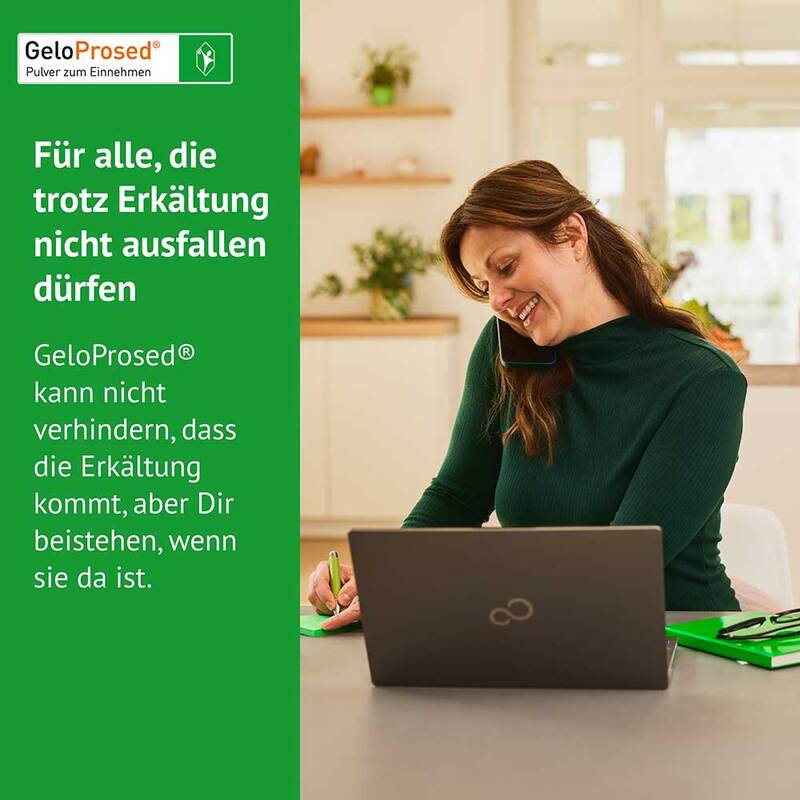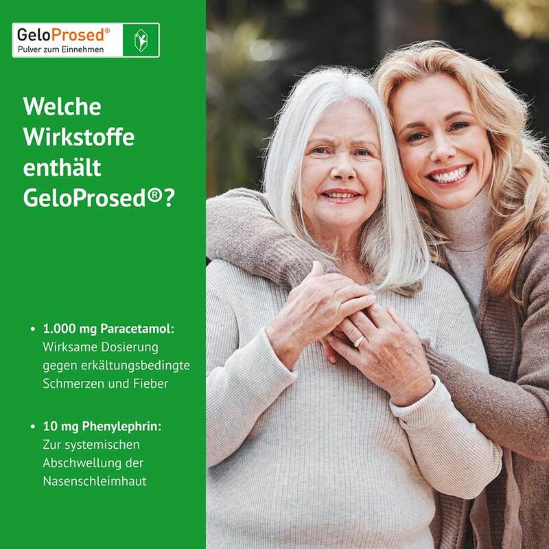 GeloProsed®. Anw.: Z. Linderung d. Symptome v. Erkältungskrankheiten u. grippalen Infekten, w. Schmerzen, Kopfschmerzen, Halsschmerzen u. Fieber, wenn diese m. einer Anschwellung d. Nasenschleimhaut einhergehen. F. Erw., ält. Patienten u. Jugendl. ab 12 Jahren. Enth. Aspartam u. Natriumcarbonat. Zu Risiken und Nebenwirkungen lesen Sie die Packungsbeilage und fragen Sie Ihre Ärztin, Ihren Arzt oder in Ihrer Apotheke. Pohl-Boskamp (6/2)