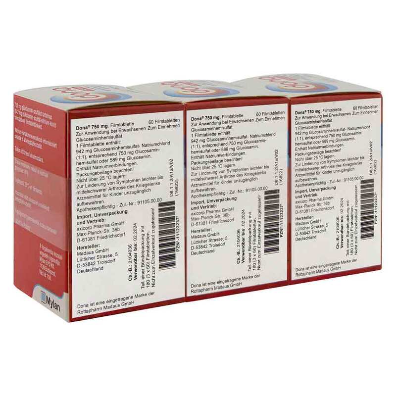 dona 750 mg Filmtabletten. Anw.: Linderung von Symptomen leichter bis mittelschwerer Arthrose des Kniegelenks. Wirkstoff: Glucosaminhemisulfat. Zu Risiken und Nebenwirkungen lesen Sie die Packungsbeilag und fragen Sie Ihre Ärztin, Ihren Arzt oder in Ihrer Apotheke. Stand 11/22.