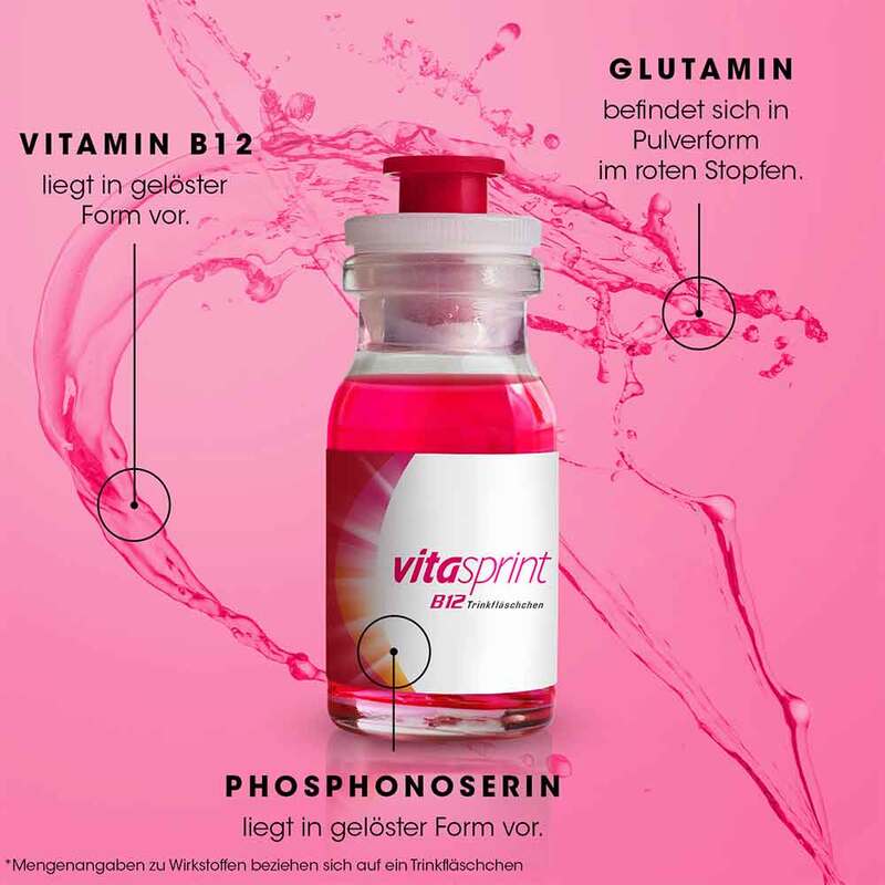 vitasprint B12 Trinkfläschchen Wirkstoff: Cyanocobalamin (Vitamin B12), (RS)-2-Amino-3-(phosphonooxy)propansäure (DL-Phosphonoserin), Glutamin. Anwendungsgebiete: Traditionell angewendet zur Besserung des Allgemeinbefindens. Warnhinweis: Enthält Natriummethyl-4-hydroxybenzoat u. Sorbitol. Freiverkäuflich. Stand: 01/2024. Zu Risiken und Nebenwirkungen lesen Sie die Packungsbeilage und fragen Sie Ihre Ärztin, Ihren Arzt oder in Ihrer Apotheke.