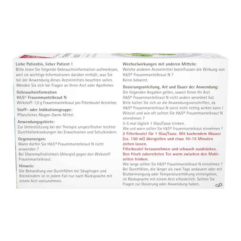 H&S® Frauenmantelkraut N. Anwendungsgebiete: Zur Unterstützung bei der Therapie unspezifischer leichter Durchfallerkrankungen. Zu Risiken und Nebenwirkungen lesen Sie die Packungsbeilage oder fragen Sie Ihren Arzt oder Apotheker. H&S Tee-Gesellschaft mbH & Co. | Heidachstr. 62 | D-88079 Kressbronn/Bodensee.