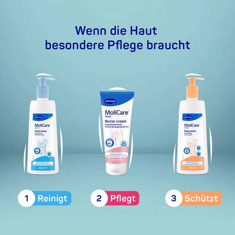 Die pHhautneutrale Waschlotion hilft den natürlichen Säureschutzmantel der Haut zu erhalten bzw. wiederherzustellen. Mit enthaltenem Panthenol und Mandelöl wird die Haut gleichzeitig auch gepflegt. Die MoliCare Skin Waschlotion sticht auch durch ihre geruchsneutralisierende Eigenschaft heraus.