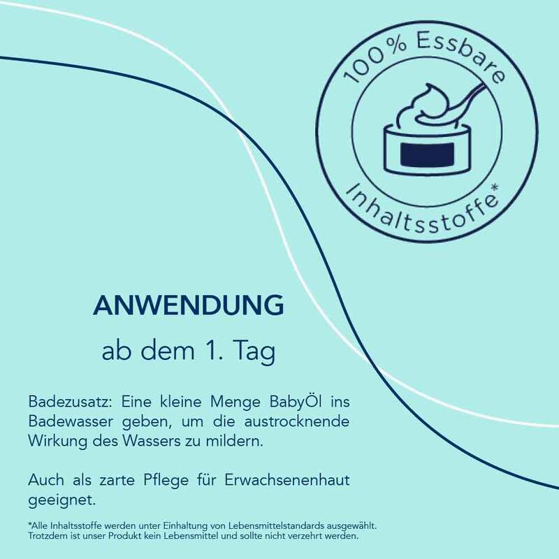- Badezusatz: Eine kleine Menge BabyÖl ins Badewasser geben, um die austrocknende Wirkung des Wassers zu mildern.