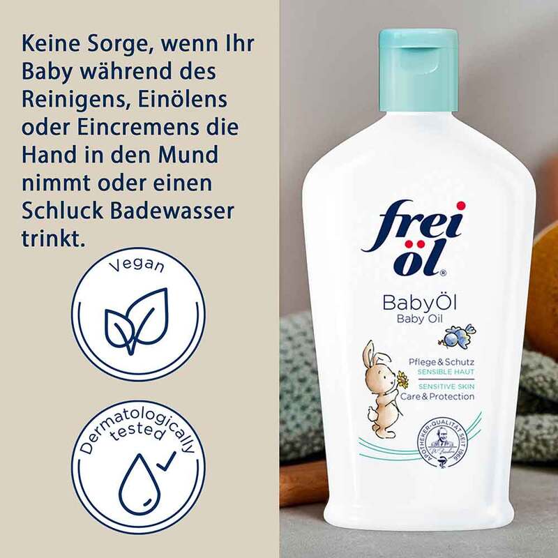 Versehentliches Verschlucken des Babyöls ist unbedenklich - jedoch ist das Produkt kein Lebensmittel und sollte nicht verzehrt werden.