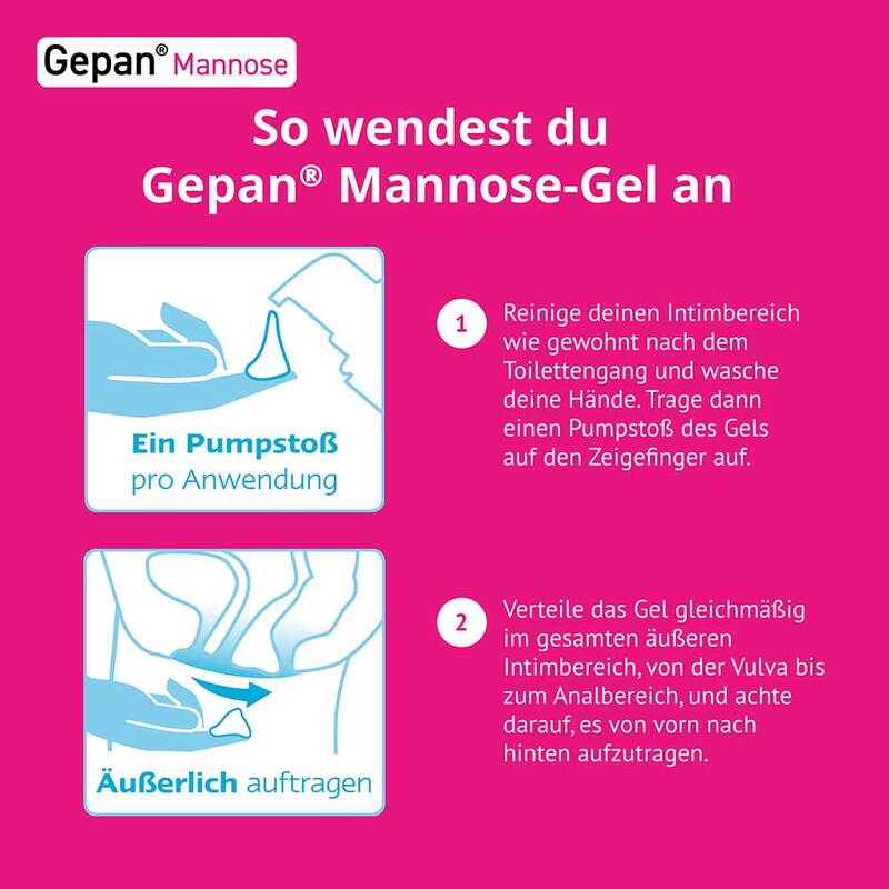 Das Gepan® Mannose-Gel mit seinem Mannose-Hydro-Komplex eignet sich hierfür besonders gut: Zum einen besitzt das Gel hautpflegende und feuchtigkeitsspendende Eigenschaften. Zum anderen bietet es Unterstützung beim Schutz gegen Keime. Übrigens: Das Gepan® Mannose-Gel ist auch während der Schwangerschaft und Stillzeit anwendbar.