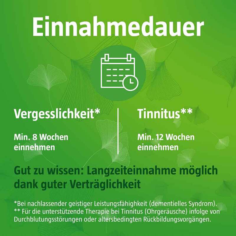 Zur Behandlung von Vergesslichkeita sollte die optimale Behandlungsdauer falls nicht anders verordnet mindestens 8 Wochen betragen. Nach einer Behandlungsdauer von 3 Monaten ist von der Ärztin oder vom Arzt zu überprüfen, ob die Weiterführung der Behandlung noch gerechtfertigt ist. Zur unterstützenden Behandlung von Ohrgeräuschenb sollte die optimale Behandlungsdauer falls nicht anders verordnet zwischen 12 Wochen und 6 Monaten liegen. Die unterstützende Behandlung sollte über einen Zeitraum von mindestens 12 Wochen erfolgen. Sollte nach 6 Monaten kein Erfolg eingetreten sein, ist dieser auch bei längerer Behandlung nicht mehr zu erwarten.