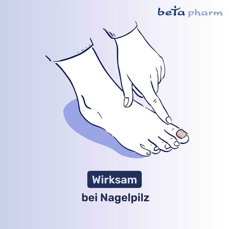 Amorolfin beta 50 mg/ml wirkstoffhaltiger Nagellack. Anw.: Top. Behandl. von Nagelpilz bei einem Befall des Nagels von weniger als 50 % (insbes. im vorderen Bereich) und weniger als 3 Nägeln. Zu Risiken und Nebenwirkungen lesen Sie die Packungsbeilage und fragen Sie Ihre Ärztin, Ihren Arzt oder in Ihrer Apotheke. betapharm Arzneimittel GmbH, 86156 Augsburg | www.betapharm.de