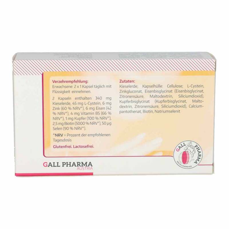 Kieselerde; Kapselhülle: Cellulose; L-Cystein, Zinkgluconat, Eisenbisglycinat (Eisenbisglycinat, Zitronensäure, Maltodextrin, Siliciumdioxid), Kupferbisglycinat (Kupferbisglycinat, Maltodextrin, Zitronensäure, Siliciumdioxid), Calciumpantothenat, Biotin, Natriumselenit.