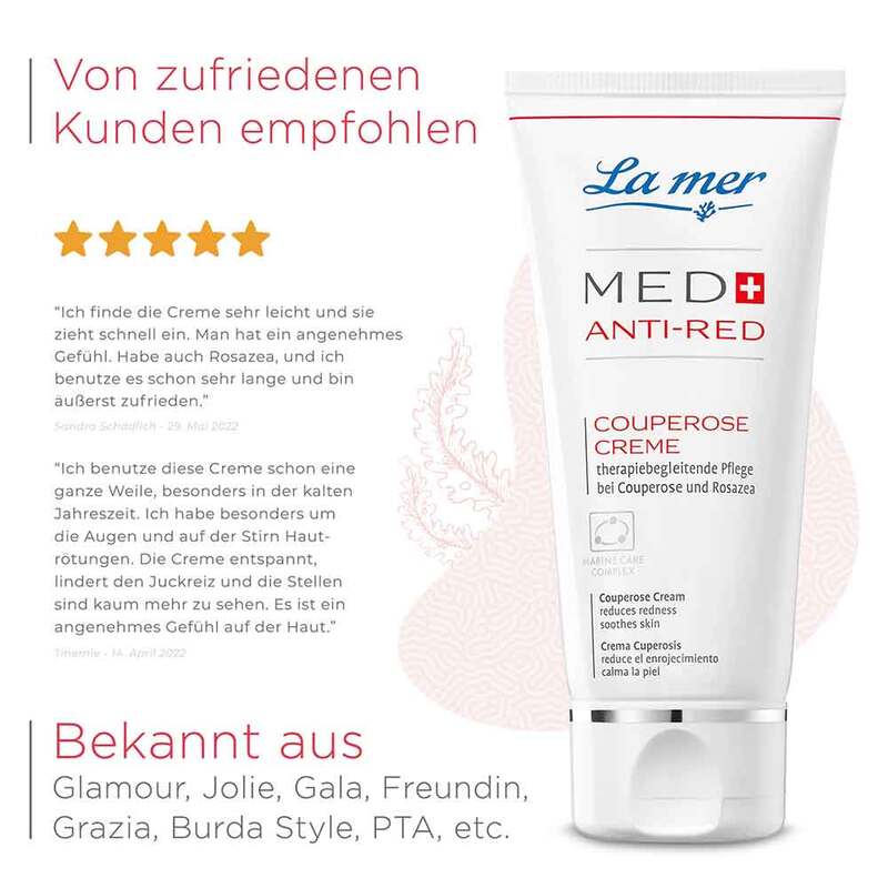 In Med+ Anti-Red wirkt der Marine Care Complex aus Meeresschlick-Extrakt, Grünalgenextrakt und Meersalz mit zusätzlichen Wirkstoffen für spezifische Bedürfnisse gereizter Haut mit vorübergehender oder dauerhafter Rötung. Die La mer Med+ Anti-Red Produkte bieten dank der Kraft des Meeres therapiebegleitende Pflege bei zu Couperose und zu Rosazea neigender Haut. So werden Hautirritationen gemildert und Rötungen kaschiert.
