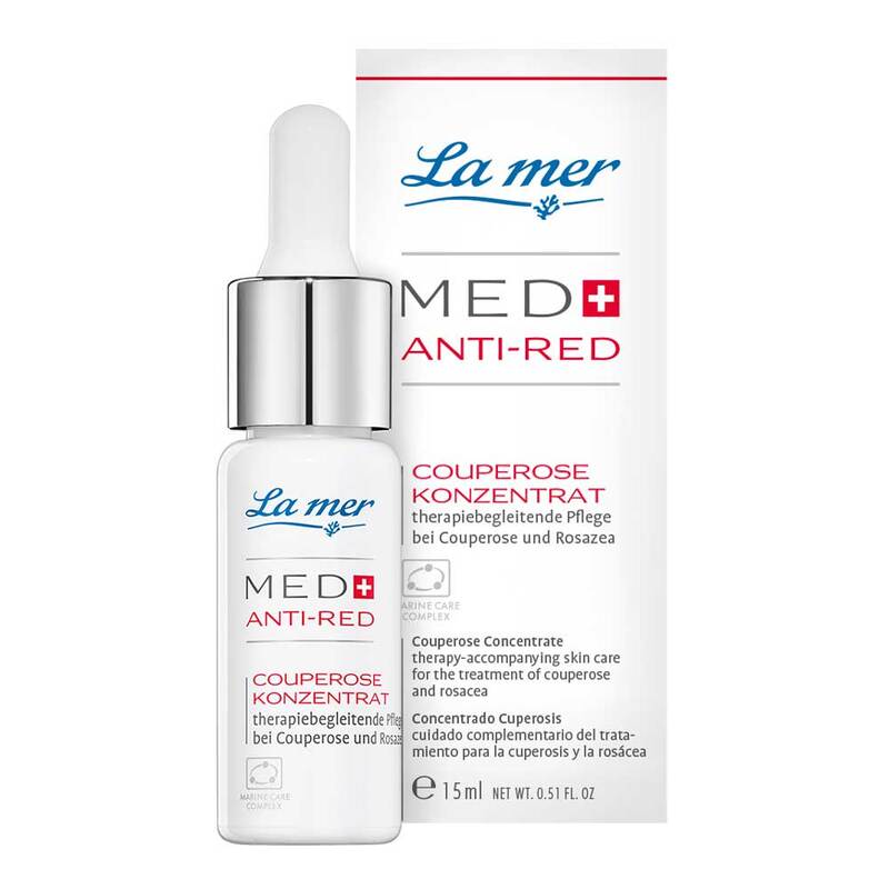 In Med+ Anti-Red wirkt der Marine Care Complex aus Meeresschlick-Extrakt, Grünalgenextrakt und Meersalz mit zusätzlichen Inhaltsstoffen für spezifische Bedürfnisse gereizter Haut mit vorübergehender oder dauerhafter Rötung. Die La mer Med+ Anti-Red Produkte bieten dank der Kraft des Meeres therapiebegleitende Pflege bei zu Couperose und zu Rosazea neigender Haut. So werden Hautirritationen gemildert und Rötungen kaschiert.