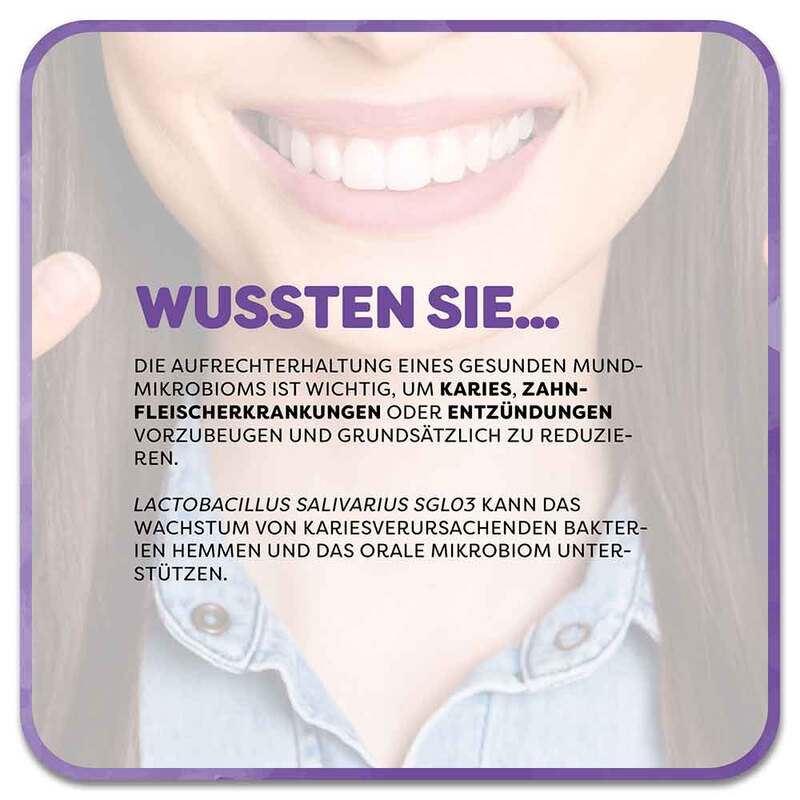 Zuckerfreier Kaugummi mit dem Bakterienstamm Lactobacillus salivarius SGL 03 und frischem Spearmintgeschmack.