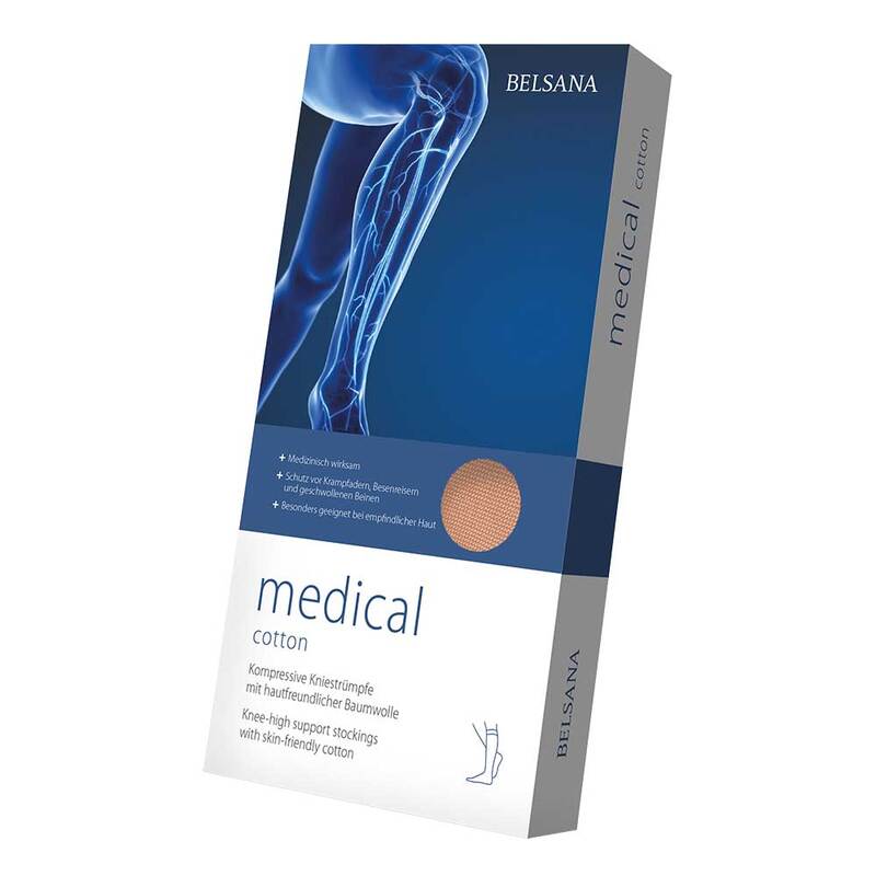 Bei den BELSANA medical cotton handelt es sich um kompressive Kniestrümpfe. Sie vereinen zahlreiche Vorteile: Sie verhindern geschwollene Füße sowie Beine, schützen vor Krampfadern und Besenreisern und wirken vorbeugend gegen Thrombosen. Dabei zeichnen sich die Strümpfe durch ihre medizinische Wirksamkeit aus. Sie sind hautfreundlich dank natürlicher Baumwolle und schenken Ihnen ein weiches Tragegefühl – sowohl für die Frau als auch den Mann!
