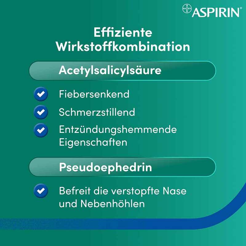 Aspirin® Complex Granulat-Sticks 500 mg/30 mg Wirkstoffe: Acetylsalicylsäure, Pseudoephedrinhydrochlorid Anwendungsgebiete: Zur symptomatischen Behandlung bei verstopfter Nase bzw. Nasennebenhöhlen (Rhinosinusitis) mit Schmerzen und Fieber im Zusammenhang mit Erkältungs- und/oder grippeähnlichen Symptomen. Hinweis: Enthält Isomalt und Benzylalkohol. Packungsbeilage beachten. Ohne ärztlichen Rat nicht länger anwenden als in der Packungsbeilage vorgegeben! Zu Risiken und Nebenwirkungen lesen Sie die Packungsbeilage und fragen Sie Ihre Ärztin, Ihren Arzt oder in Ihrer Apotheke. Bayer Vital GmbH, 51368 Leverkusen, Deutschland