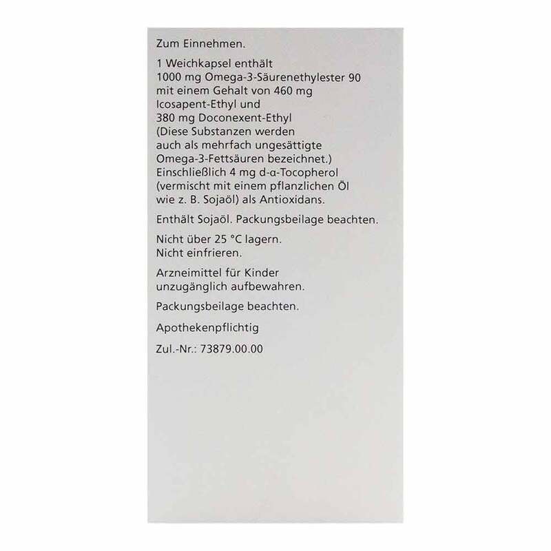 1000 mg Omega-3-Säurenethylester 90 mit einem Gehalt von 460 mg Icosapent-Ethyl und 380 mg Doconexent-Ethyl (Diese Substanzen werden auch als mehrfach ungesättigte Omega-3-Fettsäuren bezeichnet.)