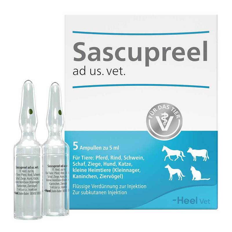 Sascupreel ad us. vet. Ampullen Flüssige Verdünnung zur Injektion. Reg.-Nr.: 402473.00.00. Registriertes homöopathisches Arzneimittel, daher ohne Angabe einer therapeutischen Indikation. Wartezeit: Pferd, Rind, Schwein, Schaf, Ziege: Essbare Gewebe: Null Tage, Pferd, Rind, Schaf, Ziege: Milch: Null Stunden. Zu Risiken und Nebenwirkungen lesen Sie die Packungsbeilage und fragen Sie die Tierärztin, den Tierarzt oder in Ihrer Apotheke. Biologische Heilmittel Heel GmbH, 76532 Baden-Baden, Dezember 2023