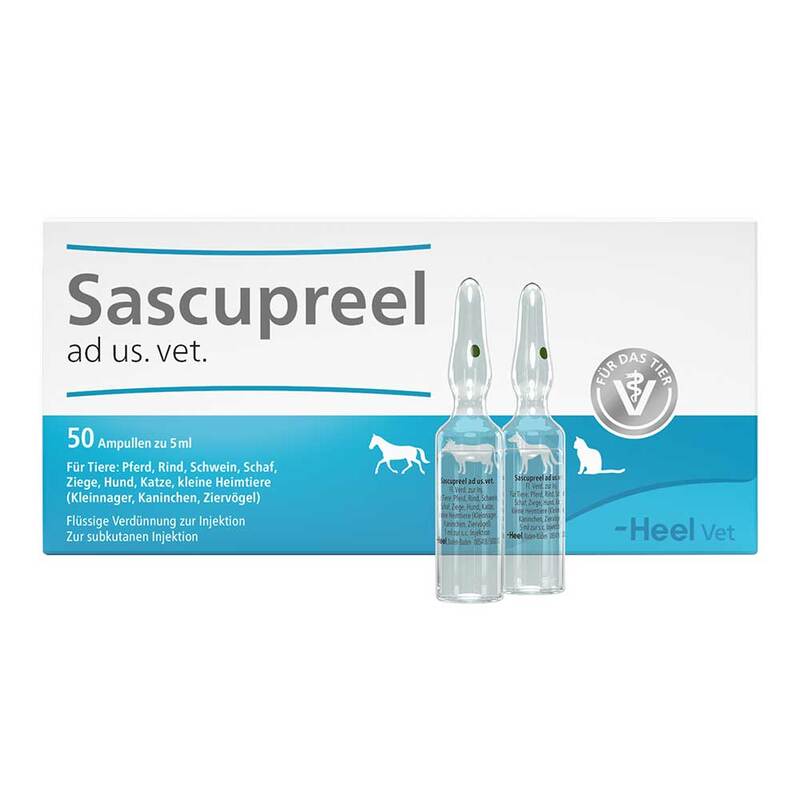Sascupreel ad us. vet. Ampullen Flüssige Verdünnung zur Injektion. Reg.-Nr.: 402473.00.00. Registriertes homöopathisches Arzneimittel, daher ohne Angabe einer therapeutischen Indikation. Wartezeit: Pferd, Rind, Schwein, Schaf, Ziege: Essbare Gewebe: Null Tage, Pferd, Rind, Schaf, Ziege: Milch: Null Stunden. Zu Risiken und Nebenwirkungen lesen Sie die Packungsbeilage und fragen Sie die Tierärztin, den Tierarzt oder in Ihrer Apotheke. Biologische Heilmittel Heel GmbH, 76532 Baden-Baden, Dezember 2023