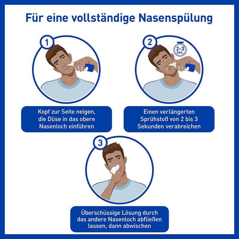 Den Kopf zur Seite neigen, den Sprühkopf in das obere Nasenloch einführen und für 2 bis 3 Sekunden gedrückt halten. Überschüssige Lösung aus dem anderen Nasenloch laufen lassen und dann die Nase putzen. Nach jedem Gebrauch den Sprühkopf mit heißem Wasser reinigen.
