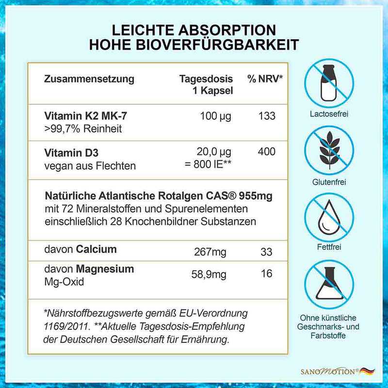 Calcium aus Rotalgen (Calcified Atlantic Seaweed,CAS® ), Hydroxypropylmethylcellulose (Kapselhülle), Magnesiumoxid, Trennmittel (Magnesiumsalze der Speisefettsäuren, Siliciumdioxid), Cholecalciferol, Menachinon-7.