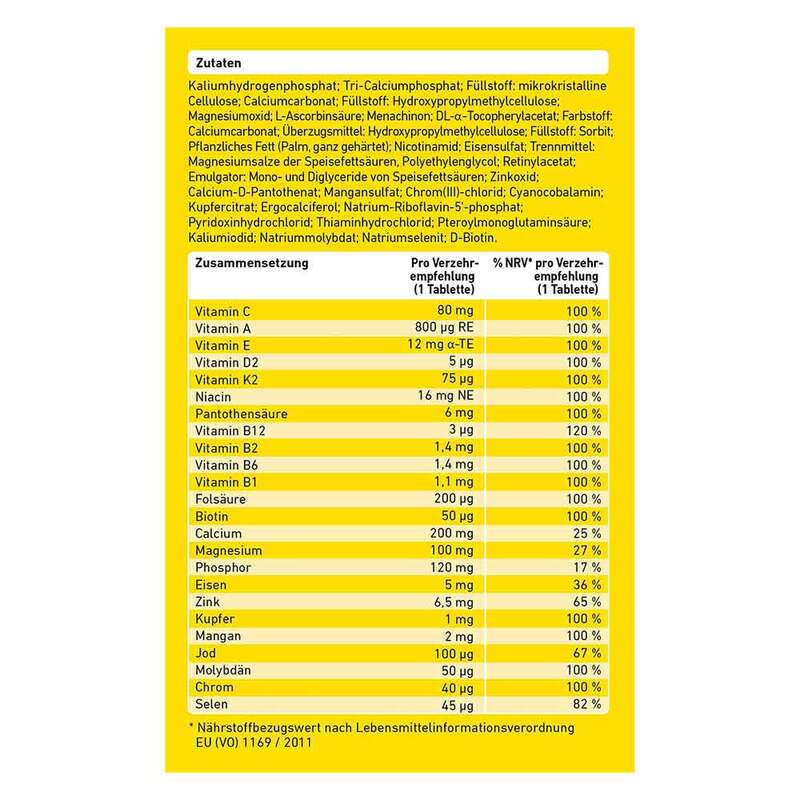 Kaliumhydrogenphosphat; Tri-Calciumphosphat; Füllstoff: mikrokristalline Cellulose; Calciumcarbonat; Füllstoff: Hydroxypropylmethylcellulose; Magnesiumoxid; L-Ascorbinsäure; Menachinon; DL-alpha-Tocopherylacetat; Farbstoff: Calciumcarbonat; Überzugsmittel: Hydroxypropylmethylcellulose; Füllstoff: Sorbit; Pflanzliches Fett (Palm, ganz gehärtet); Nicotinamid; Eisensulfat; Trennmittel: Magnesiumsalze der Speisefettsäuren, Polyethylenglycol; Retinylacetat; Emulgator: Mono- und DIglyceride von Speisefettäuren; Zinkoxid; Calcium-D-Pantothenat; Mangansulfat; Chrom(III)-chlorid; Cyanocobalamin; Kupfercitrat; Ergocalciferol; Natrium-Riboflavin-5-phosphat; Pyridoxinhydrochlorid; Thiaminhydrochlorid; Pteroylmonoglutaminsäure; Kaliumiodid; Natriummolybdat; Natriumselenit; D-Biotin.
