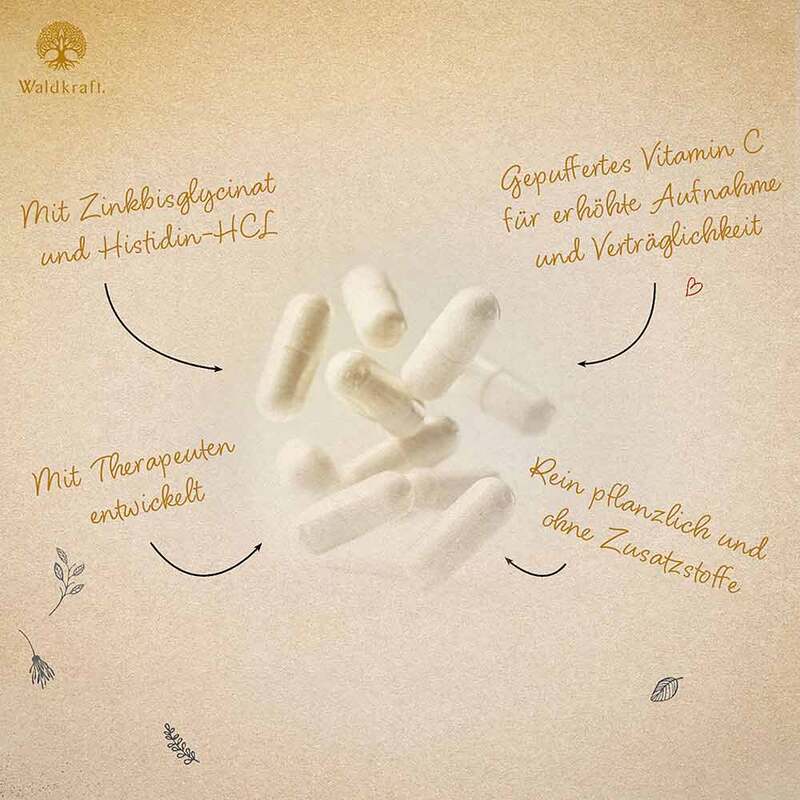 Calciumascorbat, Acerolakirschpulver, Bio-Zitronenschalenpulver, Zinkbisglycinat, Histidin-HCL, Hydroxypropylmethylcellulose (Kapselhülle)