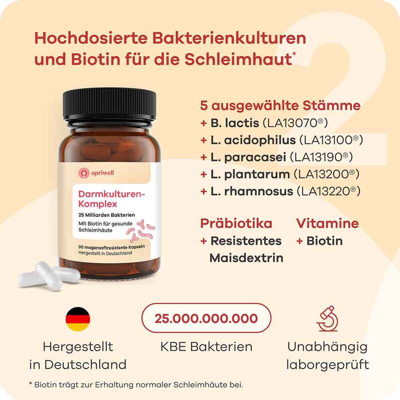 Darmkulturen-Komplex (Kapseln) (13,5g): Resistentes Maisdextrin, pflanzliche Kapselhülle (Hydroxypropylmethylcellulose, Methacrylat), vermehrungsfähige Lacto- und Bifidobakterien (L. rhamnosus LA13220®, L. acidophilus LA13100®, L. paracasei LA13190®, L. plantarum LA13200®, B. lactis LA13070®), Biotin.