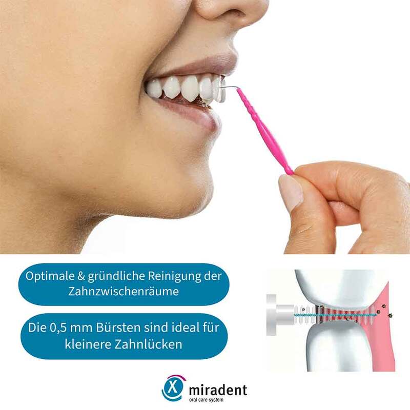 Die miradent Pic-Brush Minis sind hochwertige Interdentalbürsten der ISO-Größe 2 (PHD 0,9–1,0 mm / ? 0,5 mm), speziell entwickelt für die gründliche Reinigung enger Zahnzwischenräume – auch bei Brackets, Brücken und Zahnersatz. Ob zu Hause oder unterwegs: Diese kompakten Bürstchen sorgen für eine effektive Mundhygiene, wo immer Sie sind.