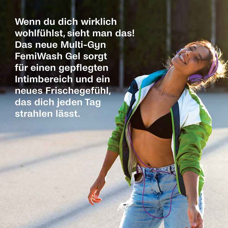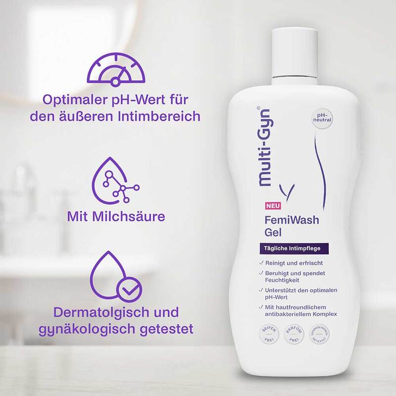 Das Multi-Gyn FemiWash Gel ist ein Intim-Waschgel, das sich ideal für den täglichen Gebrauch eignet. Der natürliche 2QR-Komplex und Panthenol beruhigen und pflegen empfindliche Haut. Dank Milchsäure fördert es einen optimalen pH-Wert und schützt die natürliche Flora im äußeren Intimbereich. Mit einem hautfreundlichen und antibakteriellen Komplex. Es ist nicht austrocknend, für empfindliche Haut geeignet und kann auch für die Intimrasur verwendet werden. Multi-Gyn FemiWash Gel passt gut zu anderen Multi-Gyn Produkten und ist dermatologisch sowie gynäkologisch getestet.