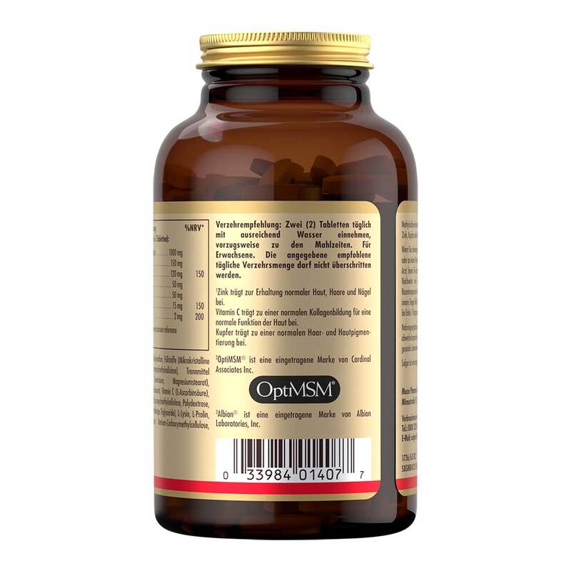 Methylsulfonylmethan, Füllstoffe (Mikrokristalline Cellulose, Hydroxypropylmethylcellulose), Trennmittel (Siliciumdioxid, Stearinsäure, Magnesiumstearat), Rotalgenpulver (L. calcareum), Vitamin C (L-Ascorbinsäure), Überzugsmittel (Hydroxypropylmethylcellulose, Polydextrose, Calciumcarbonat, Mittelkettige Triglyceride), L-Lysin, L-Prolin, Zinkcitrat, Emulgator Natrium Carboxymethylcellulose, Kupferbisglycinat.
