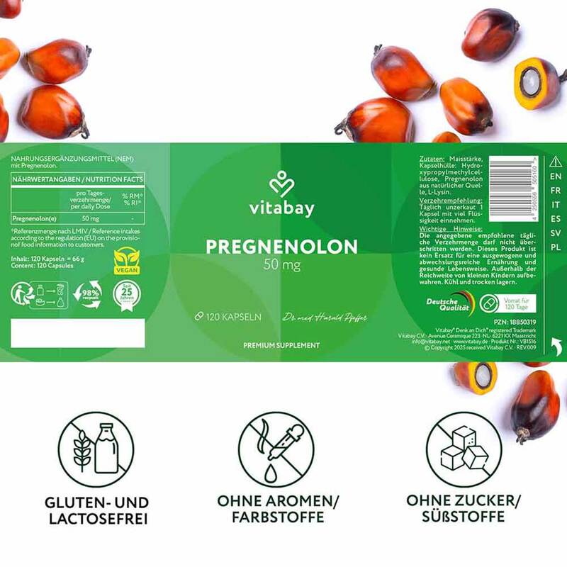 Pregnenolon von Vitabay ist natürlich und rein. Extrahiert aus dem Fruchtfleisch der roten Ölpalme bietet Vitabay Ihnen ein 100% veganes Produkt geprüfter Spitzenqualität.