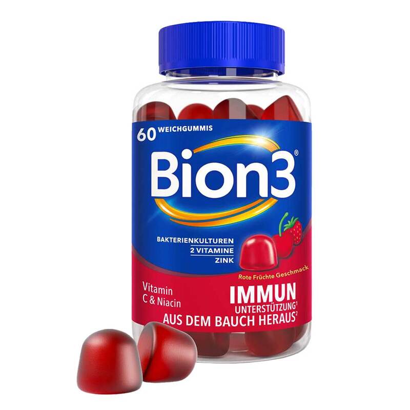 Glukosesirup; Zucker; Wasser; Vitamin C (L-Ascorbinsäure, Natrium-L-ascorbat); Geliermittel: Pektin; Niacin (Nicotinamid); Säureregulatoren: Natriumascorbat, Trinatriumcitrat; färbendes Lebensmittel (Konzentrat aus schwarzer Karotte); Zinkcitrat; Bakterienstamm Bacillus coagulans SNZ 1969; Maltodextrin; Natürliches Rote Früchte Aroma mit anderen natürlichen Aromen; Stabilisator: Citronensäure; Überzugsmittel: Carnaubawachs.