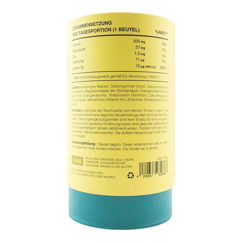 Gereinigtes Wasser, Süßungsmittel (Xylit), Calciumsalze der Zitronensäure, Magnesiumsalze der Zitronensäure, Orangensaftkonzentrat, natürliches Orangenaroma, Stabilisator (Xanthan), Säureregulator (Citronensäure), Menachinon (Vitamin K2), Zinkcitrat, Cholecalciferol (Vitamin D3).